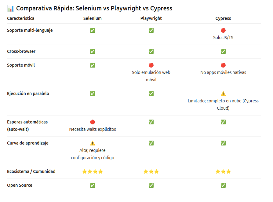 Mientras Selenium sigue siendo imbatible en compatibilidad y madurez, Playwright y Cypress están marcando el rumbo del futuro gracias a su rapidez, fiabilidad y mejor experiencia de uso.